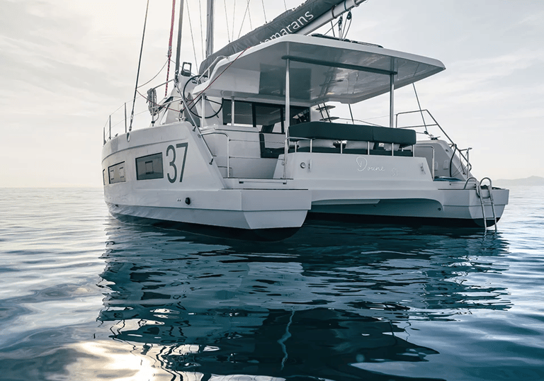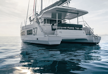 This catamaran is distinguished by an elegant and dynamic silhouette, unique in the sub- 40-foot catamaran market. A raised helm station with a double seat, is close to the sundeck for perfect connectivity.