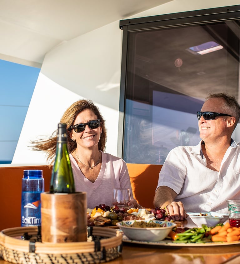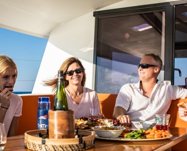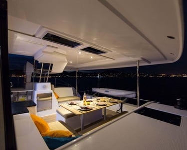 The interior of this luxury catamaran is spacious and bright from many large windows that allow for beautiful natural light. This catamaran blurs the exterior/interior boundary with a fully opening window in front of the galley sink countertop. The large salon is ample comfortable seating for 6 guests and includes a navigation area. The complete galley is set up with a fridge/freezer, oven, and microwave. Additional drinks fridge can be found in the cockpit.